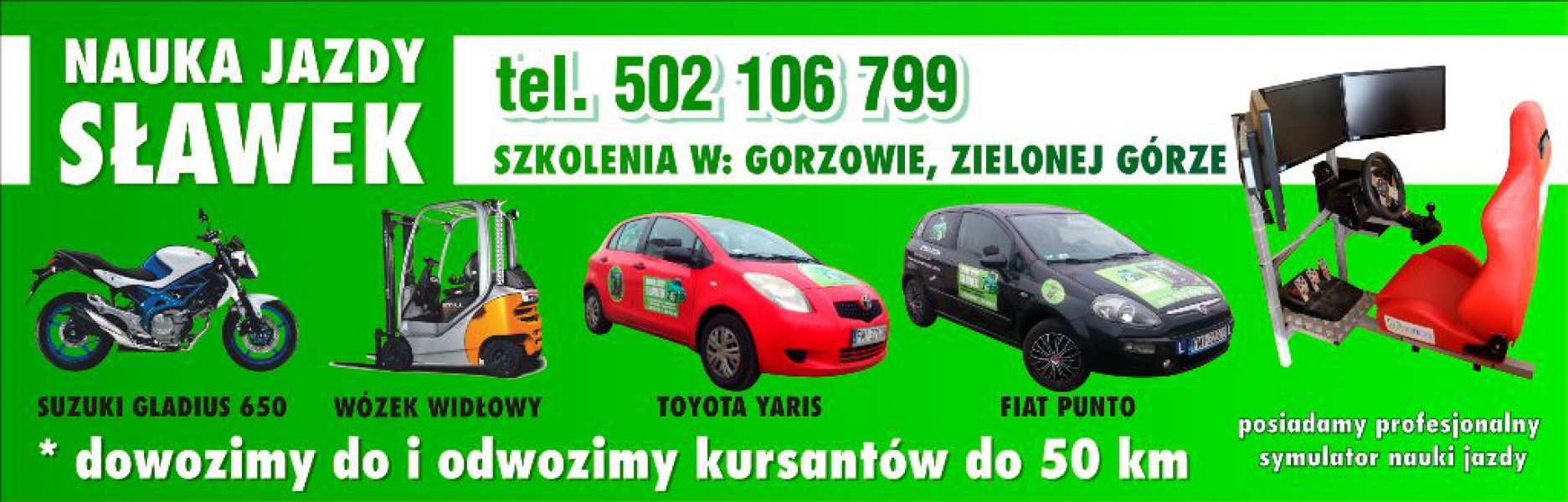 Posiadamy profesjonalny symulator nauki jazdy wiernie oddający realia jazdy samochodem. Szkolimy na samochodach na których odbywają się egzaminy w Zielonej Górze lub Gorzowie Wlkp. możliwość opłaty kursu na raty 0%. Prowadzimy szkolenia okresowe na przewóz osób oraz rzeczy dawniej kursy doskonalące. Prowadzimy szkolenia na wózki widłowe. Oferujemy szeroki zakres materiałów dydaktycznych stale uaktualnianych w cenie kursu.